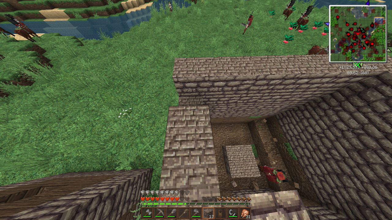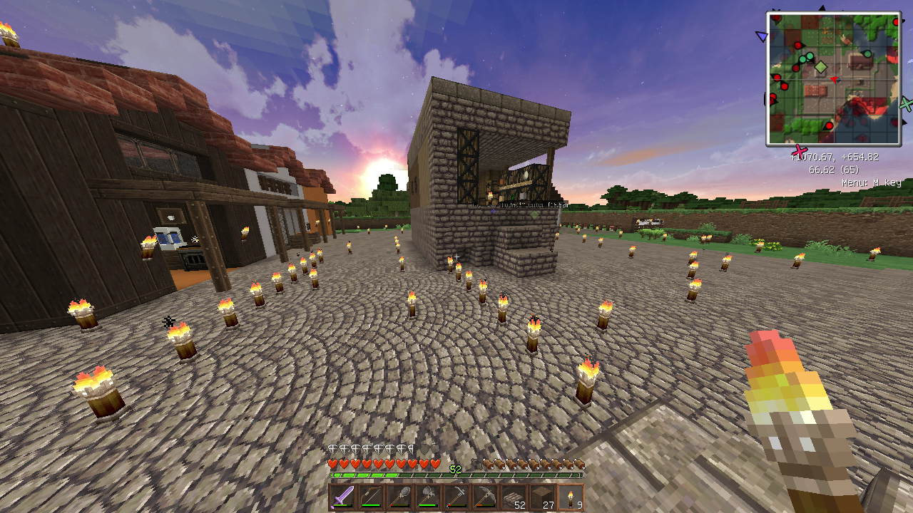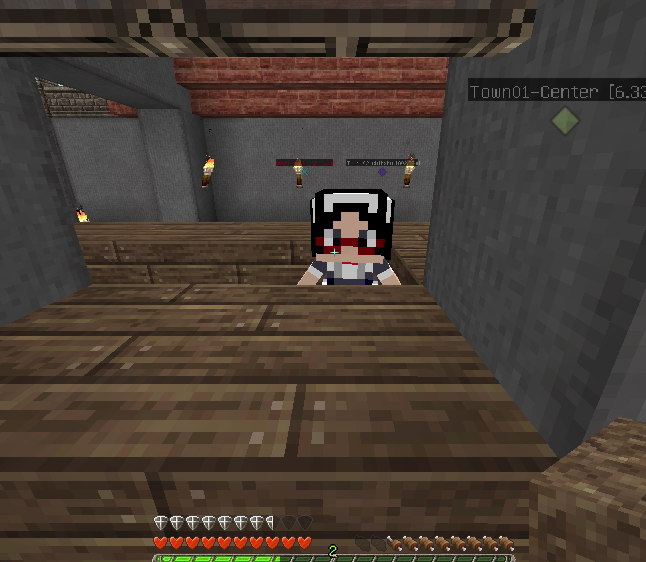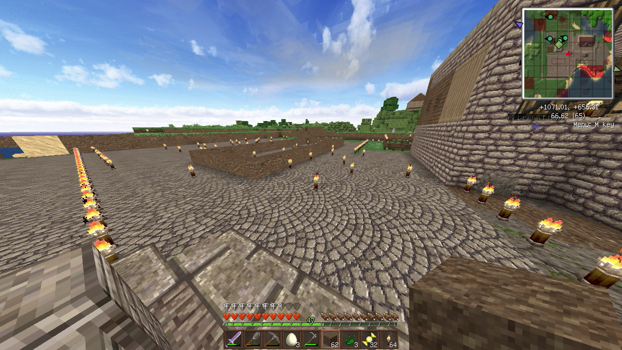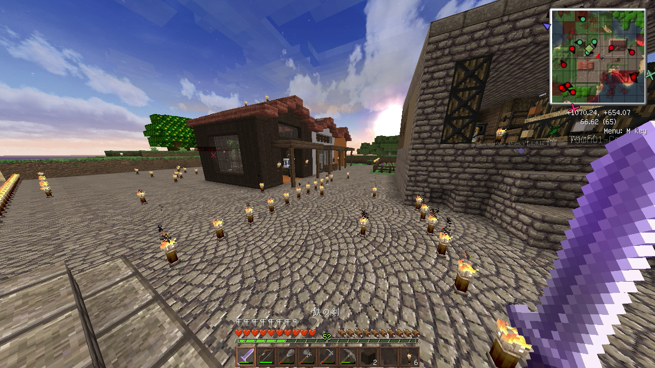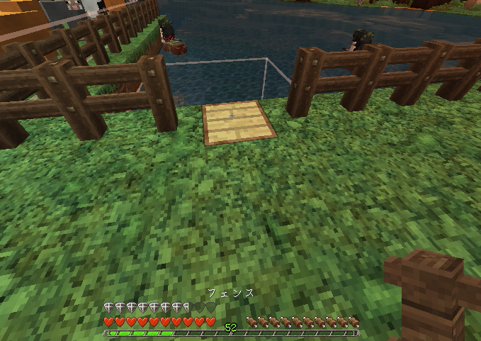 建築もひと段落し、そろそろ住人を増やしたいので、なんとかモンスター対策をしたいところ。とりあえず村人が活動するであろうエリアを柵で囲みました。