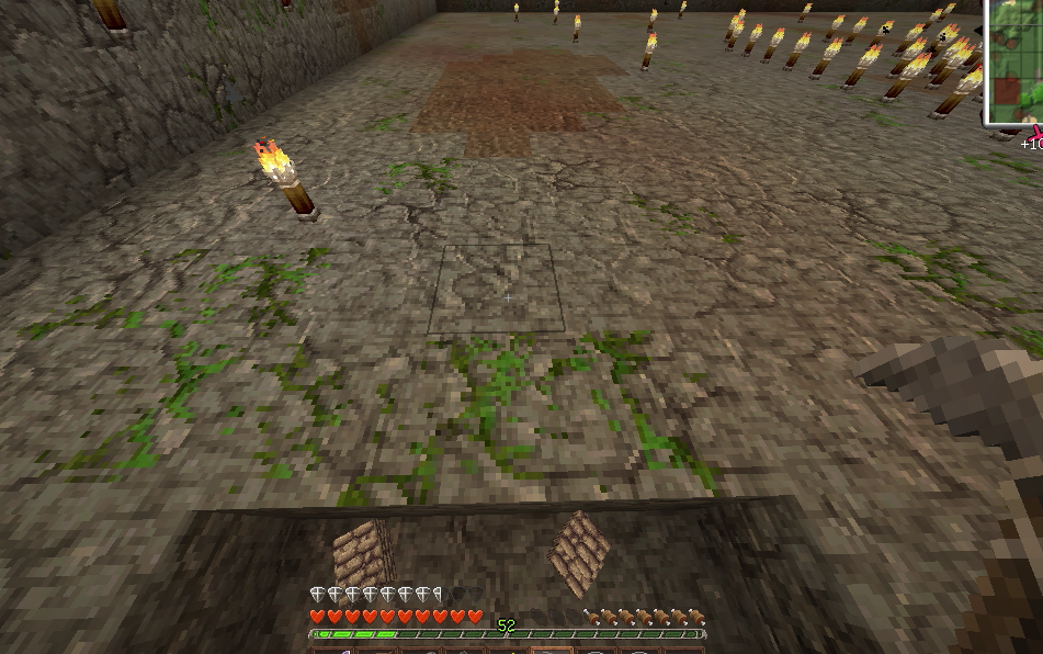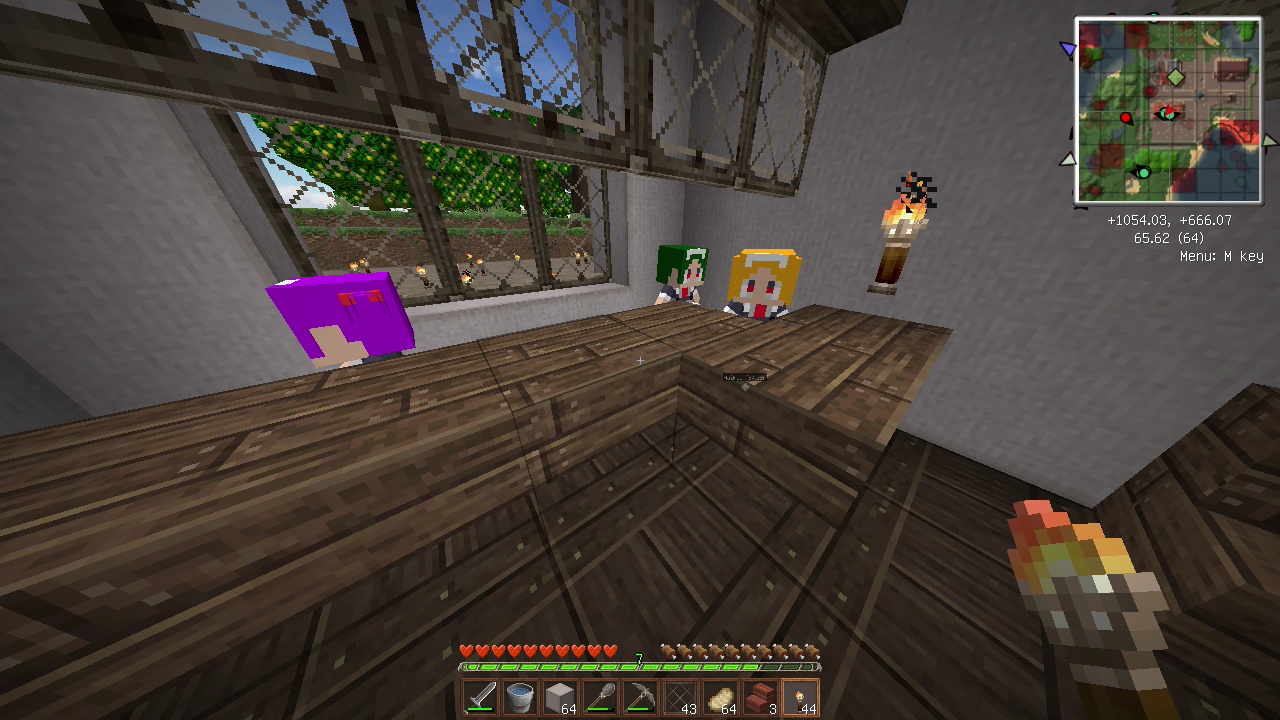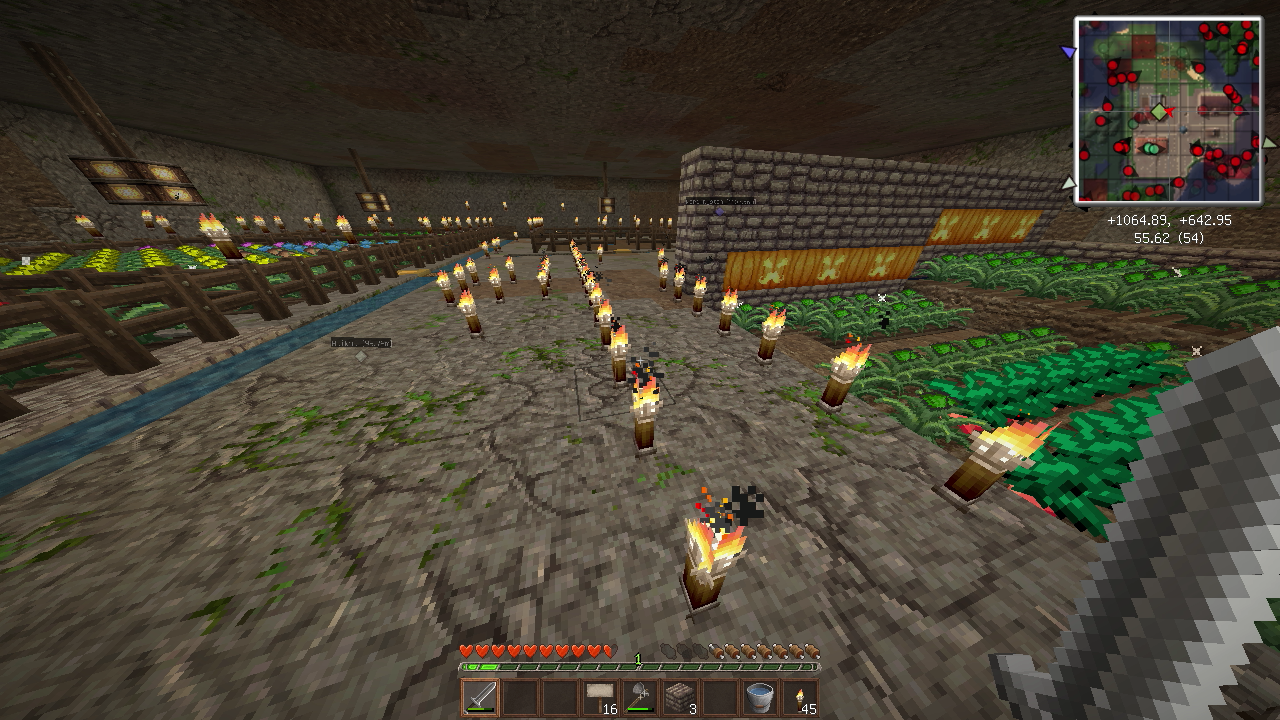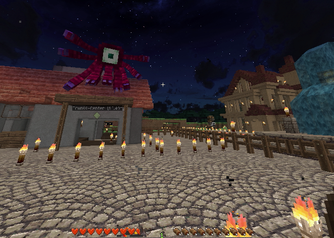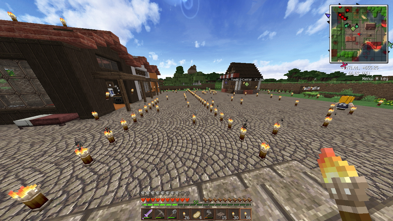 建築もひと段落し、そろそろ住人を増やしたいので、なんとかモンスター対策をしたいところ。とりあえず村人が活動するであろうエリアを柵で囲みました。