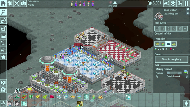 上の画像のように、キッチンを建築するとOfficerが自動的に食糧を作ってくれます。作った食糧はインベントリにストックされ、Visitorが食堂のカウンターから食糧を購入すると、ストックが減っていきます。