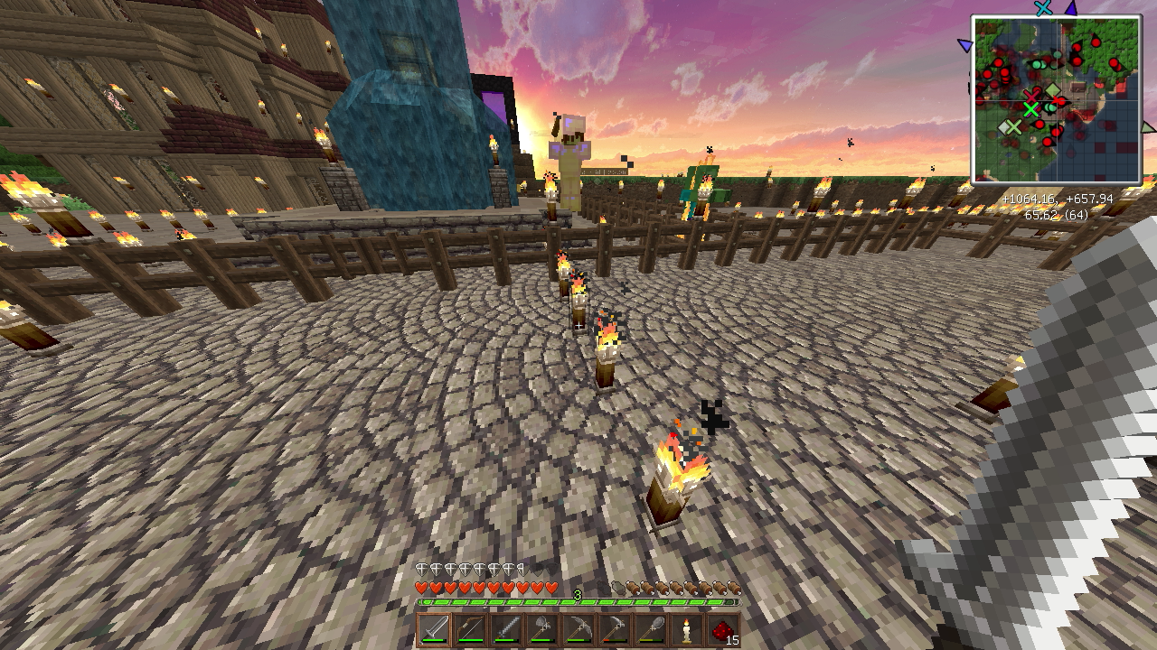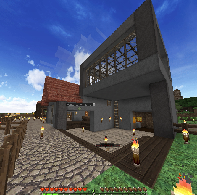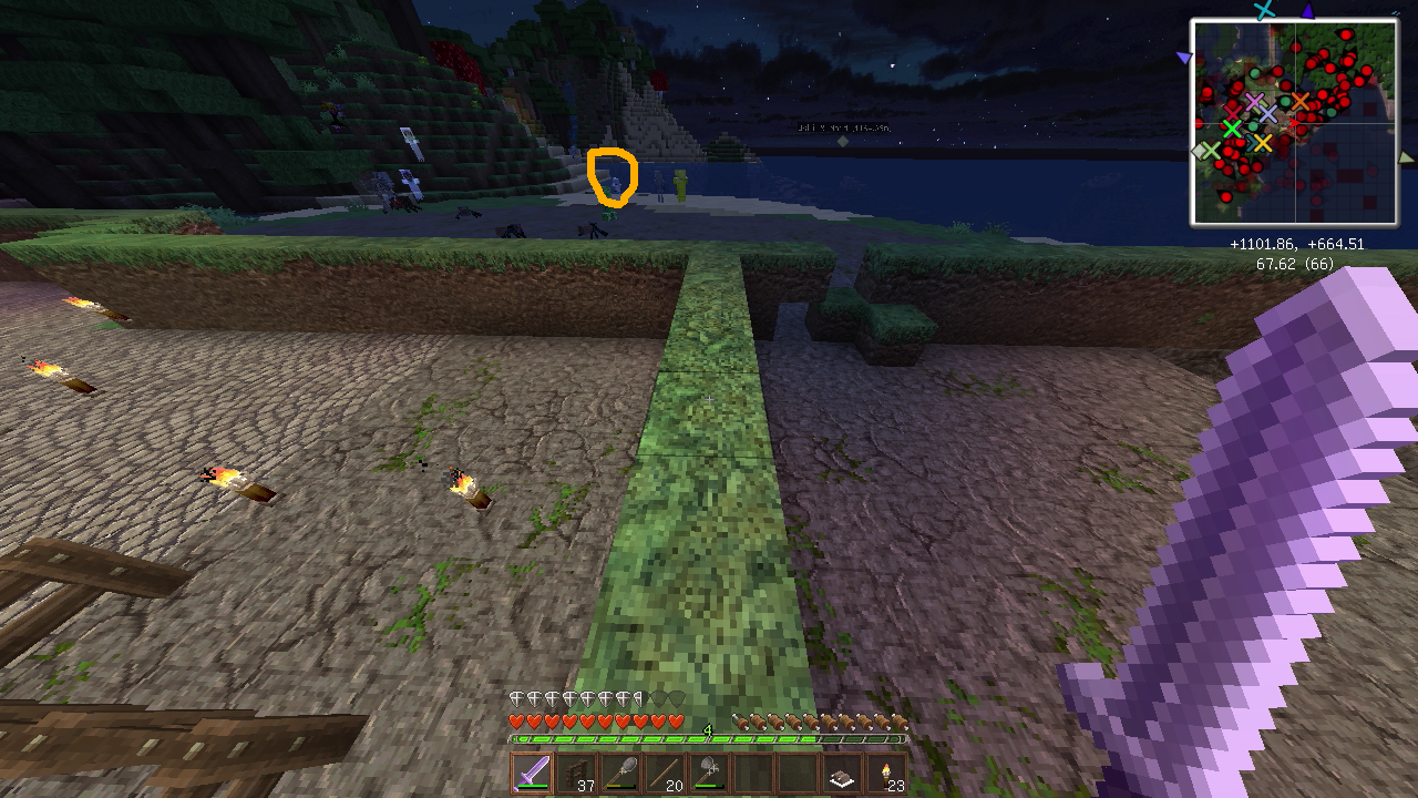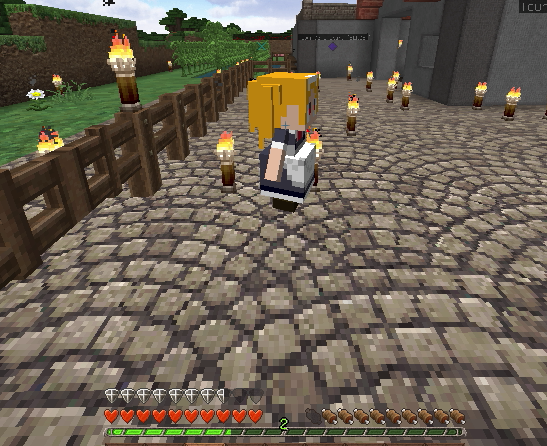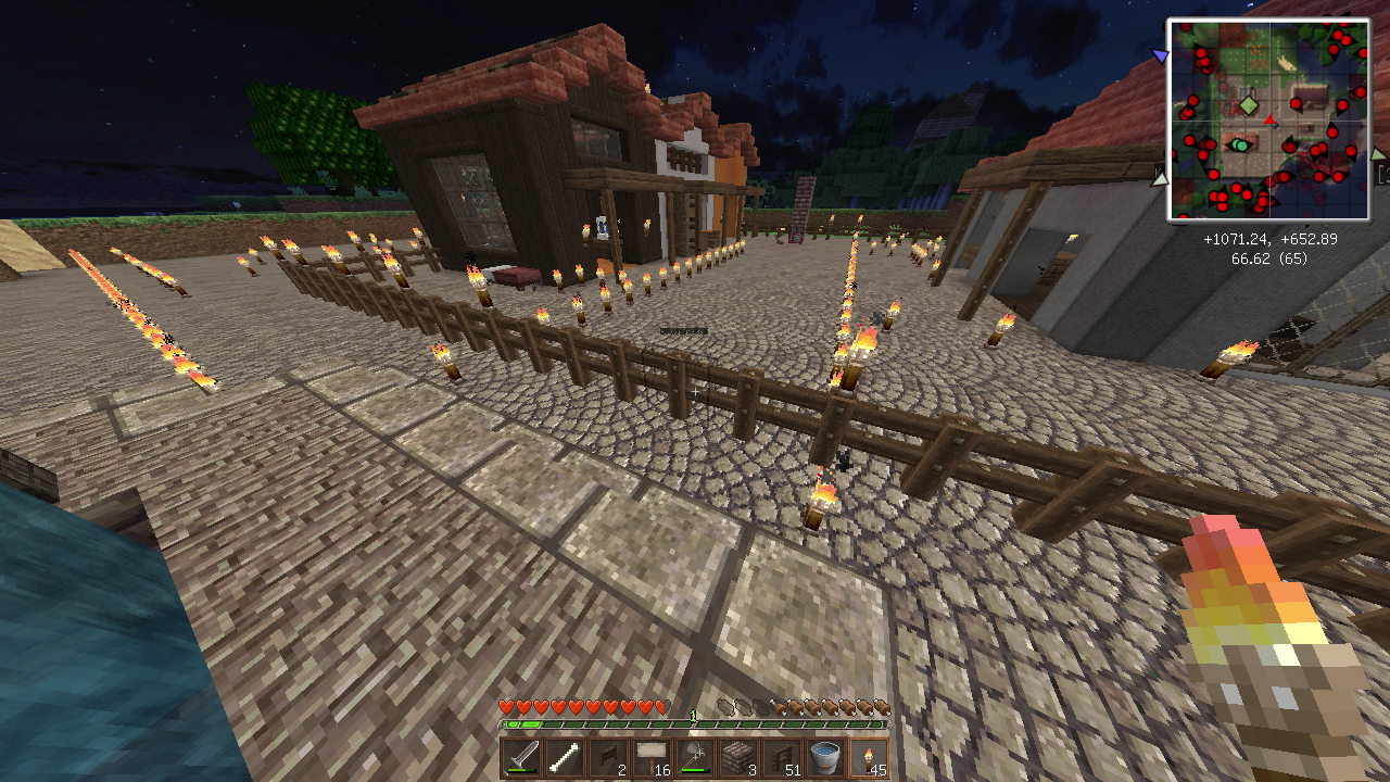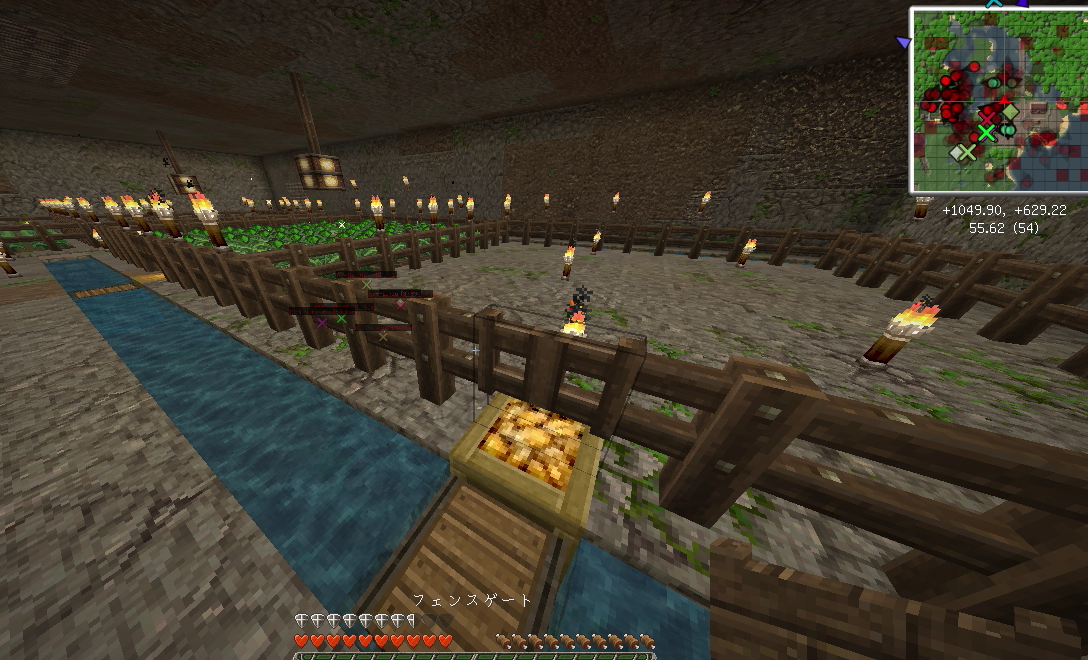 建築もひと段落し、そろそろ住人を増やしたいので、なんとかモンスター対策をしたいところ。とりあえず村人が活動するであろうエリアを柵で囲みました。