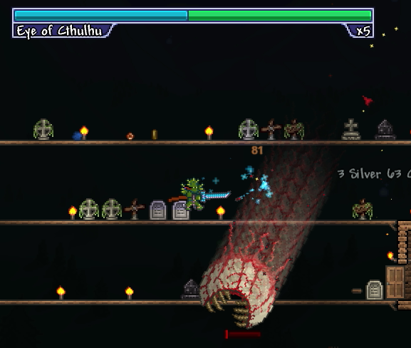 今の装備では目玉の攻撃一回で180のダメージを喰らいます。これは第一段階の時に出てくる小さい目玉も同じです。