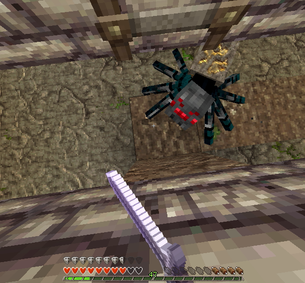 鉱石スパイダーでした。Mod「Ore Spider」により追加されたMobで倒すと背負ってる鉱石を落とします。これは金鉱石ですね。