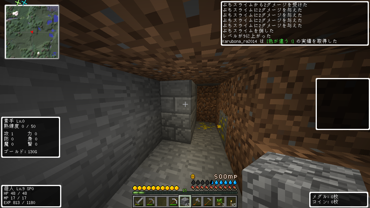 ブランチマイニングの結果。ダイヤは鉱石を10個くらいみつけました。